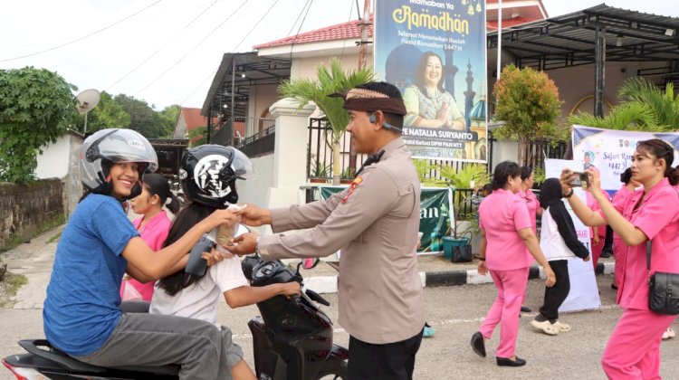 Kapolres Rote Ndao AKBP Mardiono.,S.ST.,M.K.P bersama Wakapolres Rote Ndao Kompol I Wayan Sunarta.,S.E didampingi PJU dan pengurus Bhayangkari turun langsung untuk membagikan takjil bagi masyarakat yang melintas menjelang waktu untuk berbuka puasa.
